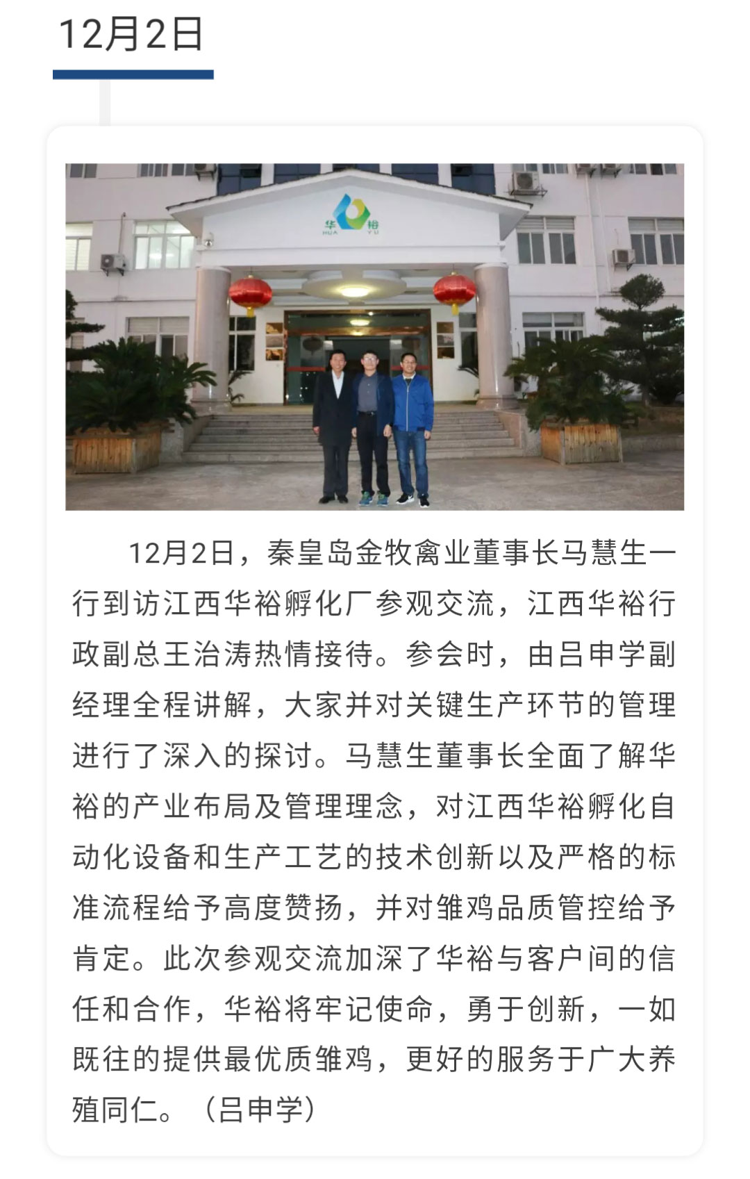【一周快報】秦皇島金牧禽業(yè)董事長馬慧生到訪江西華裕
