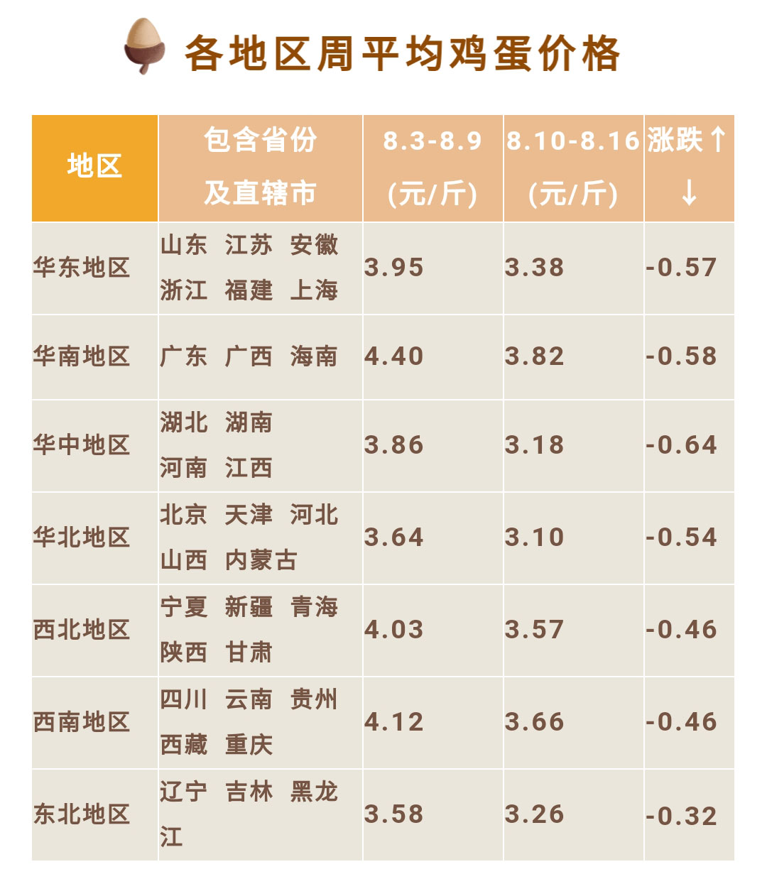 雞蛋價格 | 截止8月16日各地區(qū)周平均雞蛋價格及行情分析